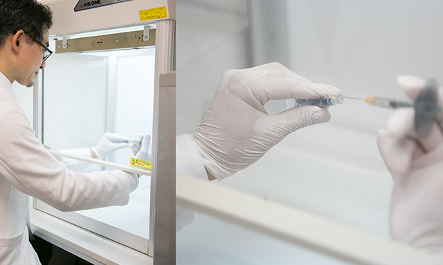 ヒアルロン酸は清潔操作で使用する薬剤です。ヒアルロン酸の小分けは、1本1本、別の新しい注射器(清潔使い捨てシリンジ)・新しい針 (清潔使い捨て注射針)を使用します。小分けの際に空気中の細菌等がヒアルロン酸に入る可能性がありますので、当クリニックでは、研究室等で使用する無菌操作装置「クリーンベンチ」内で、清潔操作でヒアルロン酸等の注入剤を小分け・管理しております。一本のヒアルロン酸を他の方に使い回すようなことは一切ありません。さらに、開封したヒアルロン酸は冷蔵庫でも細菌繁殖が起こるため、長期保存は一切行いません。